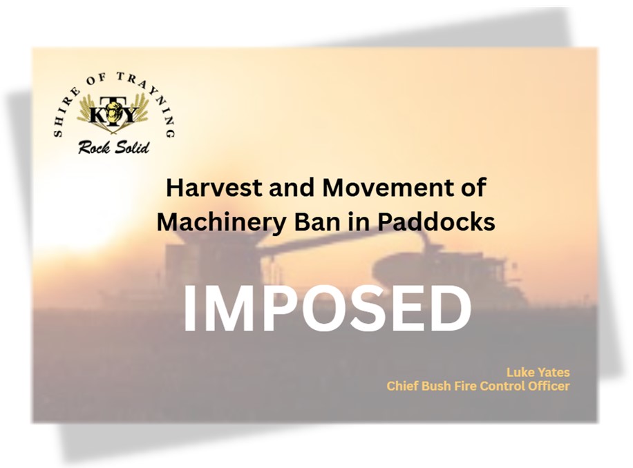 The Shire of Trayning will be imposing a Harvest and Movement of Machinery Ban for 25 December 2025 (Christmas Day) 26 December 2025 (Boxing Day ) and for 1 January 2026 (New Years Day)